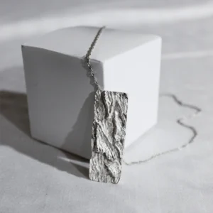 Hecho en plata Ley 950, este dije de aproximadamente 11 gramos refleja la historia de los antiguos bosques. Su textura irregular y su código QR lo convierten en una joya única para guardar tus recuerdos.